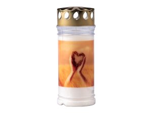 Sviečka s motívom srdca v dlaniach na cintorínske účely.
