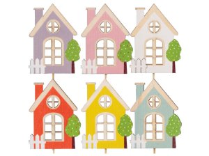 Drevený zápich v tvare domčeka sa špajdľou vo farebnom mixe, vhodný ako veselá dekorácia do kvetináčov či aranžmánov.