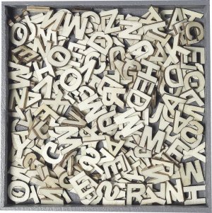 190 kusov drevených písmeniek, každé o veľkosti cca 1,3 cm.