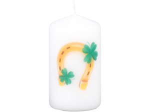 Štýlová sviečka v tvare valca s motívom podkovy a štvorlístka - symboly šťastia pre každý deň.