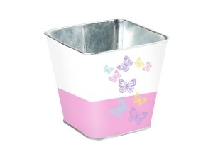 Farebný plechový kvetináč s uchami a motívom levandule – praktický aj dekoratívny doplnok.
