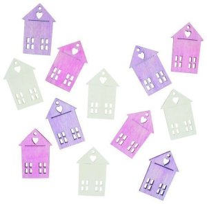 Drevené domčeky v ružovej, fialovej a bielej farbe sú určené na vytváranie dekorácií.