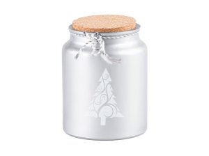 Vonná sviečka Emocio Winter Berry a Ivy Snowman – strieborné sklo s plechovým viečkom a potlačou stromčeka, ovocno-bylinková vôňa.