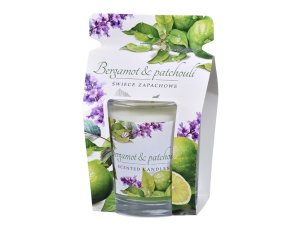 Dekoratívna vonná sviečka v skle s prírodnou potlačou vonia po bergamote a pačuli a vytvára harmonickú, osviežujúcu atmosféru.