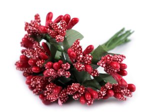 Bobuľky držia na kovovom drôtiku, ktorý je obalený floristickou páskou.