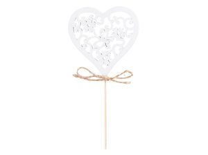 Drevený zápich v bielej farbe, srdiečko design čipky + špajle, 75 mm