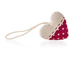Dekoratívne srdce na zavesenie, kombinácia prírodnej farby a červenej látky s bielou bodkou, materiál: bavlna, rozmer 8 x 7 cm.