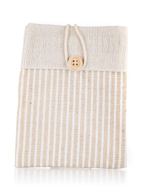 Prírodné dekoratívne vrecúško z bavlny svetlo hnedé s dekorom pruhmi a zapínaním na gombík, rozmer: 10,5 x 14 cm.