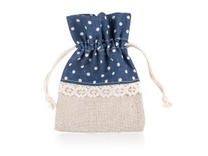 Prírodné dekoratívne vrecko z bavlny, kombinácia prírodnej a modrej bravy s dekorom bielej bodky, rozmer: 10 x 13 cm.