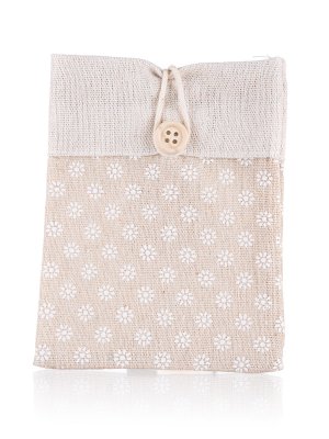Prírodné dekoratívne vrecko z bavlny svetlo hnedé s dekorom kvetu a zapínaním na gombík, rozmer: 10,5 x 14 cm.