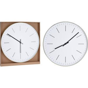 Nástenné hodiny Napájanie z batérie Rozmery 350 MM Puzdro v tvare kruhu Plastové puzdro Biela farba púzdra Ručičkový ciferník Biela farba ciferníka Ciferník s arabskými číslami