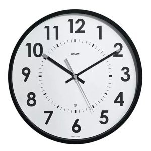 Nástenné hodiny Napájanie z batérie Rozmery 300 MM Puzdro v tvare kruhu Plastové puzdro Biela farba púzdra Ručičkový ciferník Biela farba ciferníka Ciferník s arabskými číslami