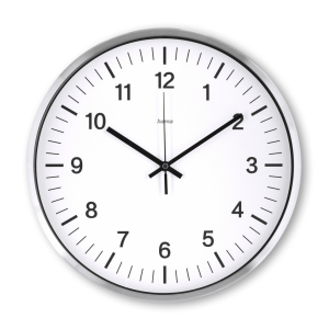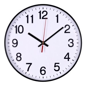 Nástenné hodiny Napájanie z batérie Rozmery 280 MM Puzdro v tvare kruhu Plastové puzdro Biela farba púzdra Ručičkový ciferník Biela farba ciferníka Ciferník s arabskými číslami