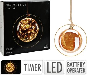 Vianočná dekorácia gule plochá svietiaca 18x5 cm jantárová vzdialenosť žiaroviek 5 cm, prívodný kábel 80 cm, prevádzka na 3 x AA batérie (nie sú súčasťou balenia), časovač 8 hod. zapnuté / 16 hod. vypnuté