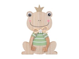 Dekorácia drevená žabka s korunkou prírodná s glitrom v zelenej farbe 120x180mm
