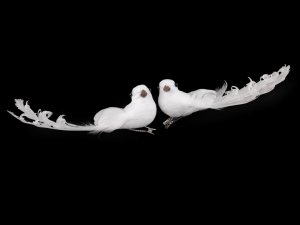 Dekoračnú [holubica] zdobia pôsobivé [kučeravé] pierka.