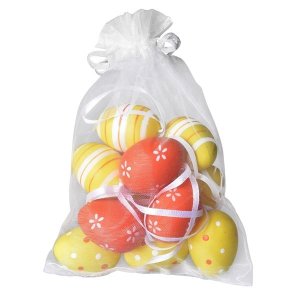 Súprava dvanástich dekoratívnych kraslíc o veľkosti 40 mm, uložených v elegantnom organzovom sáčku Každý kus je zdobený iným vzorom a farebným prevedením, čo dodá veľkonočnej výzdobe pestrosť a hravosť.