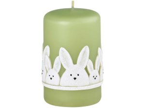 Veľkonočná sviečka v tvare valca je ozdobená vyrezávaným obrázkom zajaca s vajciami a kvetmi.