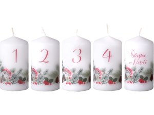Súprava adventných stupňovitých sviečok v tvare valca, so špicatou hlavou.