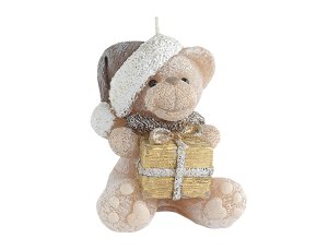 Figurálna sviečka v podobe medvedíka s červenou čiapkou a šálom držiaci šedý darček.