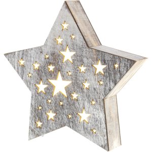 Vianočná dekorácia - hviezda drevená s perforáciou v tvare hviezdičiek Rovnomerné podsvietenie Farba svetla: teplá biela Rozmery: 24 x 4,6 x 22 cm Vhodné iba pre vnútorné použitie (IP 20) Napájanie: 2x AAA Batérie …