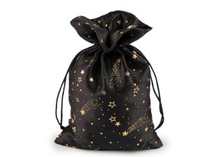 Vianočné darčekové vrecúško je stredne veľké, z oboch strán ozdobené potlačou zlatých metalických hviezdičiek.