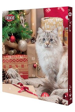 Adventný kalendár pre mačky s maškrtami v 24 okienkoch.