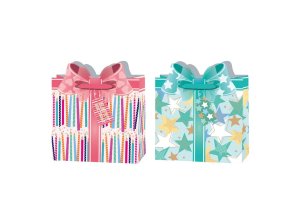 Darčeková taška o rozmere 180×80×230 mm s motívom párty darčekov a balónikov.