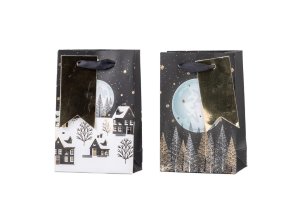 Darčeková taška 100×150 mm - zimná krajina, mix motívov v čiernej, bielej a zlatej farbe.