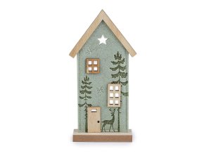 Dekoračný domček má základ z pevného filcu a strechu, podstavec a detaily z dreva.