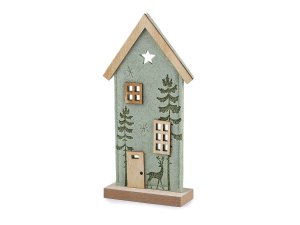 Svietiaci domček je vyrobený z kombinácie dreva a pevného filcu.