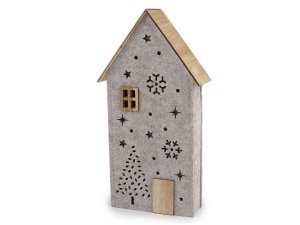 Svietiaci dekoračný domček má základ z pevného filcu a strechu a detaily z dreva.