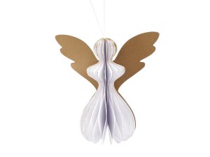 Závesná dekorácia v tvare anjela je vyrobená z plástvového papiera, ktorý pri roztiahnutí vytvára efekt pripomínajúci včelie plásty.