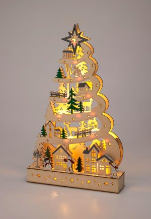 Osvetlená vianočná dekorácia domyMateriál: topoľové drevoRozmer: 29,7 x 5,8 x 14,5 cmVýška základne 2,8 cm3 domy, 7 postáv, 4 stromčeky, 2 lampyTeplé biele LED svetloBatérie 2 x AA nie sú súčasťou baleniaFarba: …