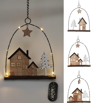 Dekorácia závesná DOMČEK 6LED, 20,5 cm, kov/drevo. rozmery: 20,5 x 1,5 x 18 cm materiál: drevo, kov farba: prírodný / čierna mix dekorov - 3 varianty batérie 2 x CR2032, sú súčasťou Závesný drevený …