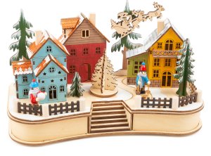 Osvetlená vianočná dekorácia domyMateriál: topoľové drevoRozmer: 40 x 20 x 16,5 cmPolkruhový tvar s 3 domami a 13 postavičkamiFarba: prírodná
