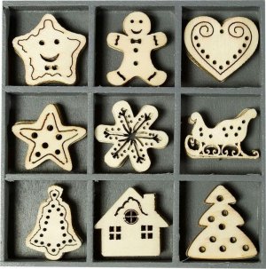Drevené ozdoby v praktickom boxe, 9 motívov po 5 ks od každého motívu, celkom teda 45 kusov dekorácií.