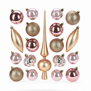 Obsah sady: 1 ks matná špička na stromček (28 cm) 2 ks lesklej cibuľky (6 cm) 2 ks matnej cencúle (12 cm) 8 ks hladkých gulí (6 cm): 2 ks lesklé, 2 ks matné, 2 ks s trblietkami , 2 ks perleťové 6 ks hladkých …