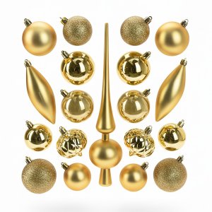 Sada 25 kusov vianočných ozdôb v tradičnej zlatej farbe Vyrobené z odolného materiálu Balenie obsahuje 25 ozdôb v niekoľkých dizajnoch a veľkostiach - guľôčky (6 x 4 cm a 12 x 6 cm) - hviezdy (5 x 11 cm) - …