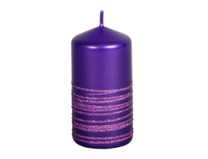 Fialová vianočné sviečka v tvare valca zdobená fialovými glitrovými prúžky.