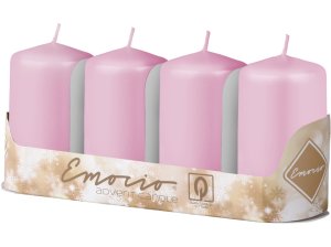 Súprava adventných sviečok. Majú tvar valca a povrch majú hladký, v úprave metalický lesk.