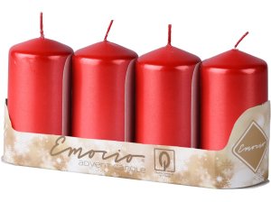 Súprava adventných sviečok. Majú tvar valca a tvoria kombináciu niekoľkých druhov dekorov: matný, metalický, lakovaný a brokátový.