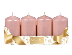 Súprava adventných sviečok. Majú tvar valca a povrch majú hladký, v úprave metalický lesk.