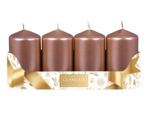 Súprava adventných sviečok. Majú tvar valca a povrch majú hladký, v úprave metalický lesk.