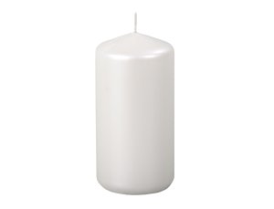 Sviečka v tvare valca má matný povrch a je zdobená trblietavými vločkami.