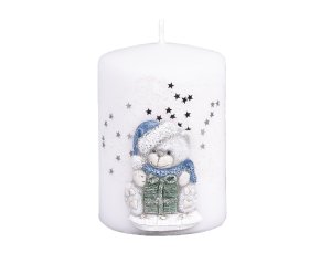 Vianočná sviečka v tvare valca je ozdobená medvedíkom v zimnom období.
