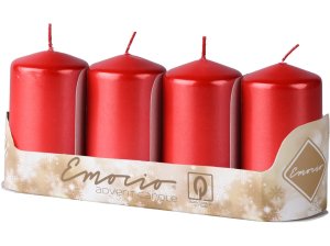 Súprava adventných sviečok. Majú tvar valca a povrch majú hladký, v úprave metalický lesk.