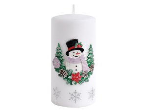 Vianočná sviečka v tvare valca, s plochou hlavou, s plastickou aplikáciou snehuliaka a vločiek pôsobí dekoratívne a sviatočne.