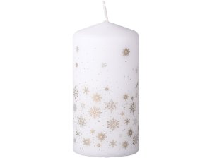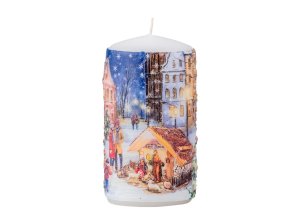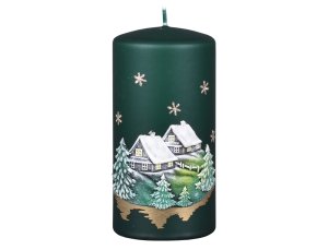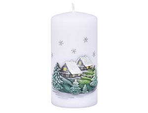 Vianočná sviečka v tvare valca, s plochou hlavou, s plastickou aplikáciou zasnežených chalúpok, pôsobí dekoratívne a hodí sa najmä na obdobie Vianoc a zimy.