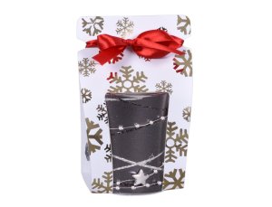 Vonná sviečka v skle ozdobenom glitrovými prúžkami a hviezdičkami.